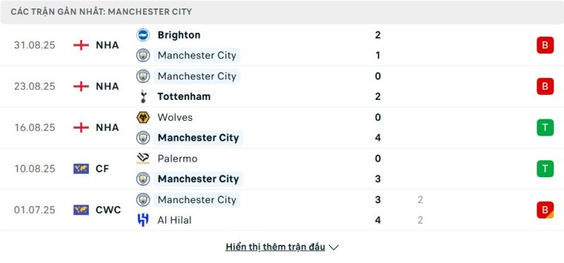 5 trận gần nhất của Manchester City: L-L-W-W-D