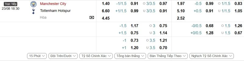 Bảng Tỷ lệ kèo bóng đá Manchester City vs Tottenham Hotspur