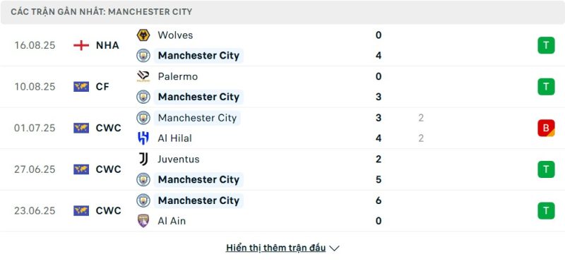 5 trận gần nhất của Manchester City: W-W-D-W-W