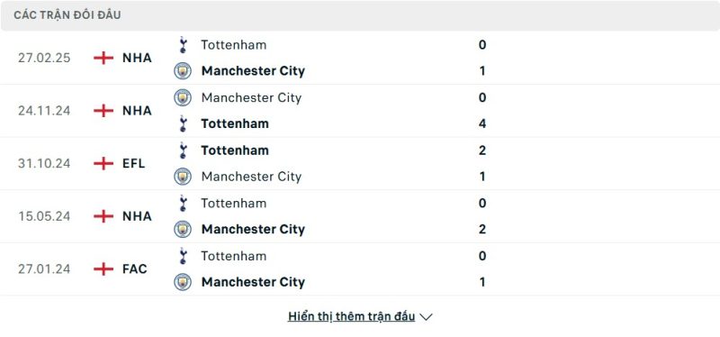 Thành tích đối đầu của Manchester City vs Tottenham Hotspur