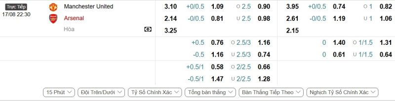 Bảng Tỷ lệ kèo bóng đá Manchester United vs Arsenal