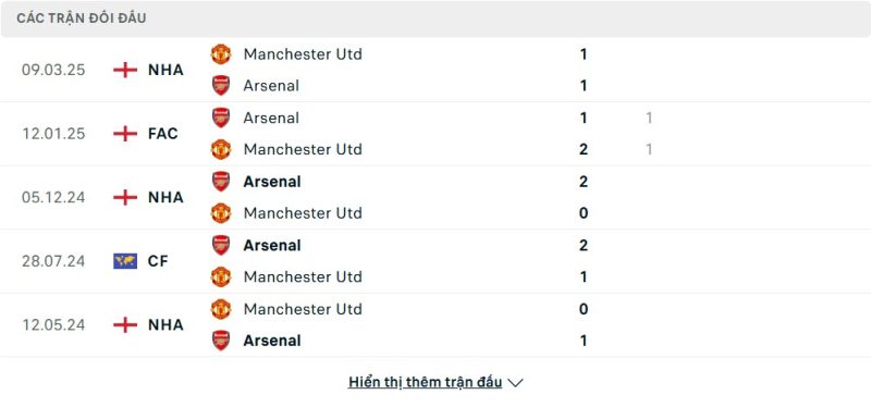 Thống kê phong độ gần đây Manchester United vs Arsenal