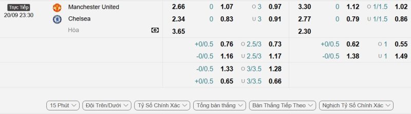 Bảng Tỷ lệ kèo bóng đá Manchester United vs Chelsea