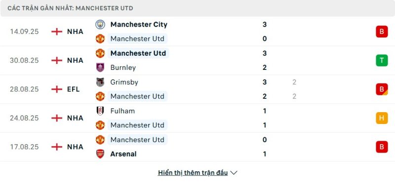5 trận gần nhất của Manchester United: L-W-D-D-L