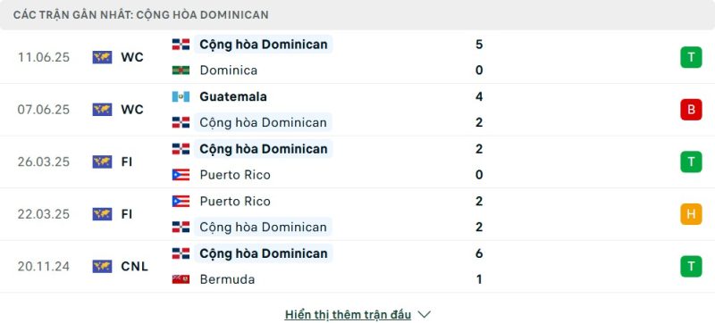 5 trận gần nhất của Cộng hòa Dominica: W-L-W-D-W