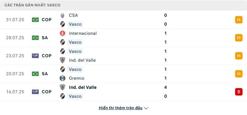 5 trận gần nhất của Vasco da Gama: D-D-D-D-L