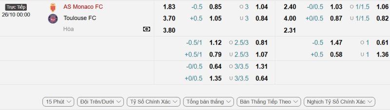 - Kèo tỷ số bóng đá hiệp 1: Monaco 0-2 Toulouse
