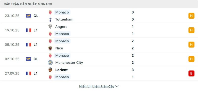 Monaco đang tạm đứng thứ 7 trên bảng xếp hạng Ligue 1 với 14 điểm sau tám vòng đấu, cho thấy sự ổn định nhưng thiếu bứt phá. Đội bóng của HLV Sébastien Pocognoli trải qua chuỗi trận khá thất thường, đặc biệt là ở những trận hòa liên tiếp gần đây trước Angers, Nice và Tottenham. Dẫu vậy, điểm sáng đến từ những trận thắng đậm như trước Metz và Strasbourg, khi hàng công thể hiện khả năng tận dụng cơ hội tốt. Ở đấu trường châu Âu, họ cầm hòa Man City và Tottenham, chứng minh tiềm năng nhưng cần thêm sự ổn định để quay lại nhóm dẫn đầu.