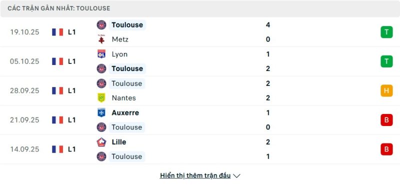 5 trận gần nhất của Toulouse: W-W-D-L-L