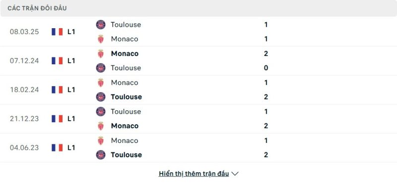 Thống kê phong độ gần đây Monaco vs Toulouse