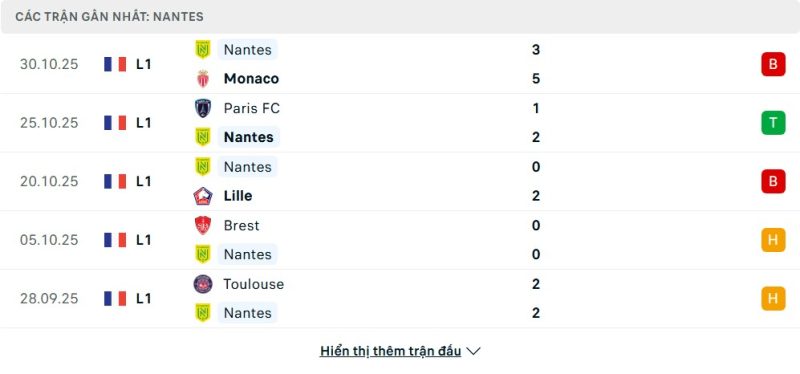 Nantes đang trải qua một giai đoạn đầu mùa giải đầy khó khăn khi rơi xuống vị trí thứ 15 trên bảng xếp hạng, chỉ có 9 điểm sau 10 vòng đấu. Phong độ của họ rất đáng báo động với chỉ 2 chiến thắng, 3 trận hòa và 5 thất bại. Trong 5 trận gần nhất, “Chim hoàng yến” chỉ thắng 1, đó là chiến thắng bất ngờ 2-1 trước Paris, nhưng cũng để thua 2 trận và hòa 2. Trận thua 3-5 mới đây trước AS Monaco và thất bại 0-2 trước Lille đã phơi bày nhiều điểm yếu, đặc biệt là ở hàng phòng ngự.
