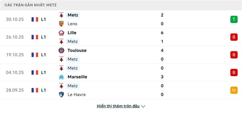 5 trận gần nhất của Metz: W-L-L-L-D