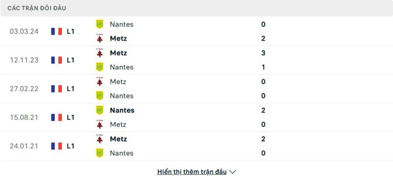 Thành tích đối đầu của Nantes vs Metz
