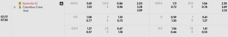 Bảng Tỷ lệ kèo bóng đá Nashville SC vs Columbus Crew