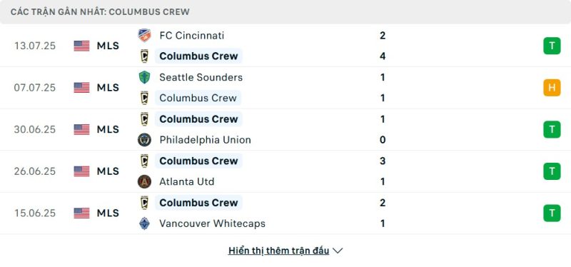 5 trận gần nhất của Columbus Crew: W-D-W-W-W