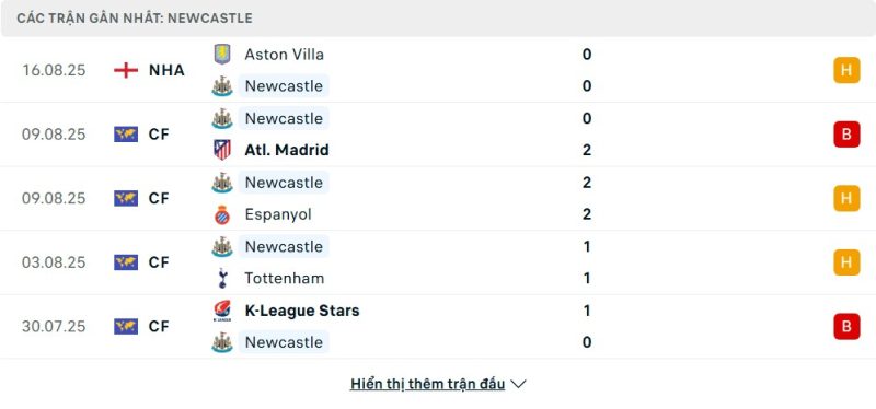 5 trận gần nhất của Newcastle United: D-L-D-D-L
