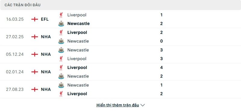 Thành tích đối đầu của Newcastle United vs Liverpool