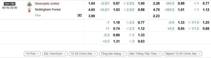 Bảng Tỷ lệ kèo bóng đá Newcastle United vs Nottingham Forest