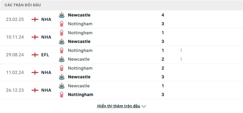 Thành tích đối đầu của Newcastle United vs Nottingham Forest