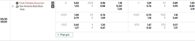 Bảng Tỷ lệ kèo bóng đá Olimpia vs San Antonio Bulo-Bulo