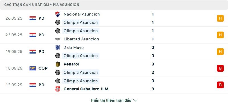 5 trận gần nhất của Olimpia: D-D-D-L-L