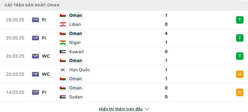 5 trận gần nhất của Oman: W-W-W-D-D