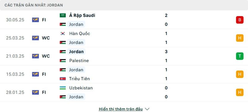 Trong khi đó, Jordan dưới thời HLV Jamal Sellami đang thể hiện phong độ ổn định. Họ bất bại trong 5 lượt trận gần nhất, giành được 2 chiến thắng và 3 trận hòa. Đặc biệt, họ vừa có chiến thắng 3-1 quan trọng trước Palestine, và cầm hòa thành công Hàn Quốc với tỷ số 1-1, kết quả cho thấy đội bóng áo trắng đang có sự chuẩn bị chiến thuật kỹ lưỡng và giàu tính thực dụng.