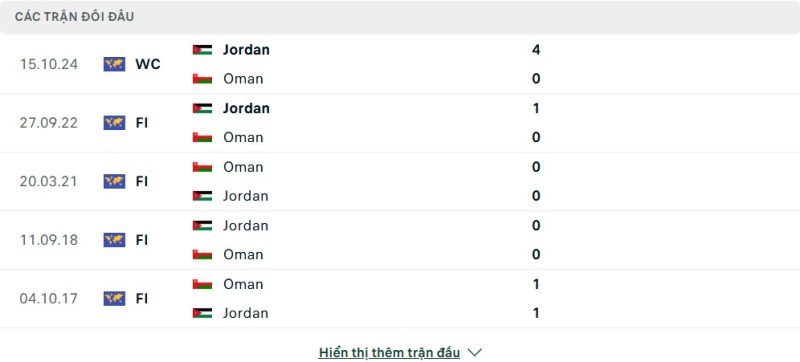 Thành tích đối đầu của Oman vs Jordan