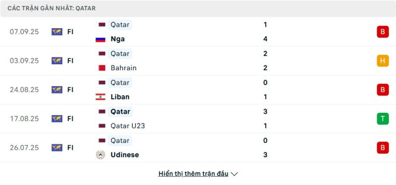 5 trận gần nhất của Qatar: L-D-L-W-L