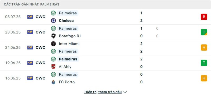 5 trận gần nhất của Palmeiras: L-D-D-W-D
