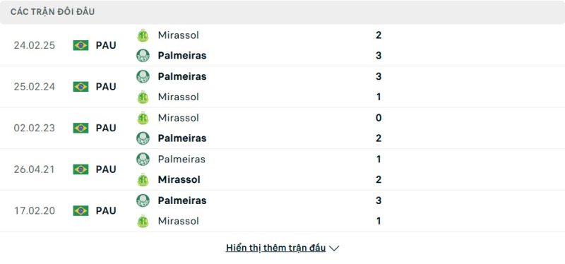 Thành tích đối đầu của Palmeiras vs Mirassol