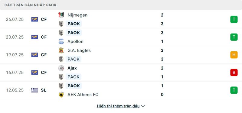 PAOK vừa kết thúc mùa giải thành công và có chuỗi trận giao hữu ấn tượng để chuẩn bị cho mùa giải mới. Đội bóng Hy Lạp đã giành 3 chiến thắng trong 5 trận đấu gần nhất, bao gồm cả chiến thắng thuyết phục 3-2 trước Nijmegen và 3-1 trước Apollon. Trận hòa 3-3 với G.A. Eagles cũng cho thấy sức mạnh tấn công của họ. Tuy nhiên, trận thua 1-2 trước Ajax cũng là một lời nhắc nhở về sự thiếu ổn định trong phòng ngự.