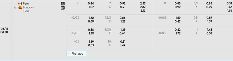 Bảng Tỷ lệ kèo bóng đá Peru vs Ecuador