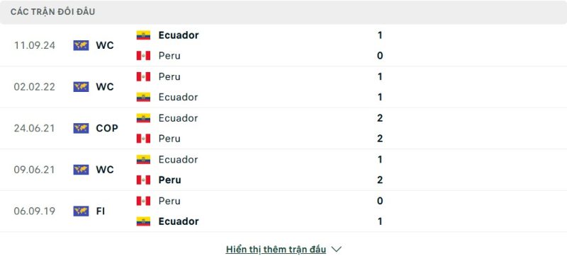 Thành tích đối đầu của Peru vs Ecuador