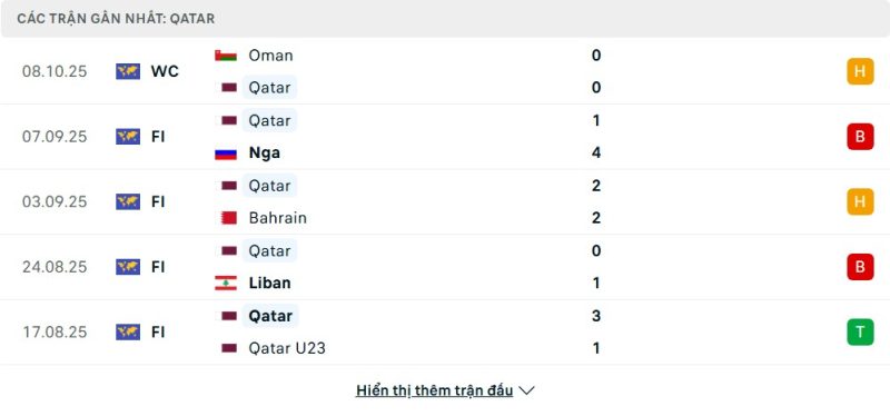 5 trận gần nhất của Qatar: D-L-D-L-W