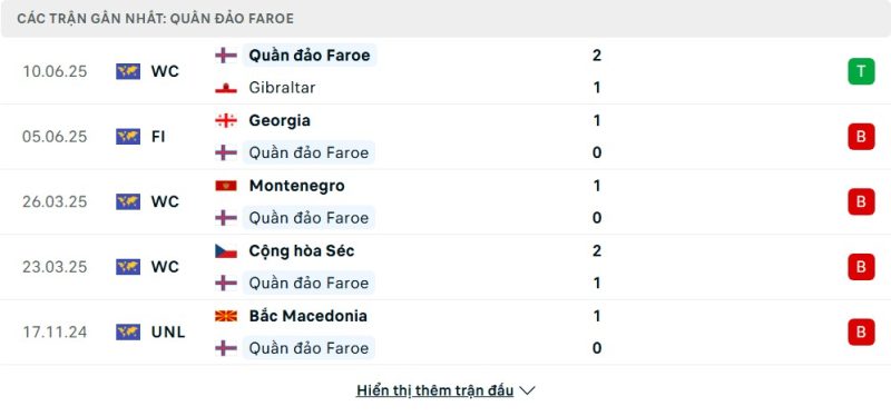 5 trận gần nhất của Quần đảo Faroe: W-L-L-L-L