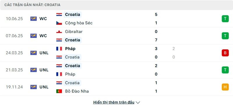 5 trận gần nhất của Croatia: W-W-L-W-D