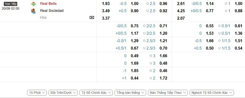 Bảng Tỷ lệ kèo bóng đá Real Betis vs Real Sociedad