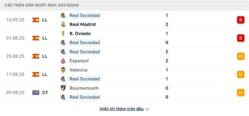 5 trận gần nhất của Real Sociedad: L-L-D-D-D