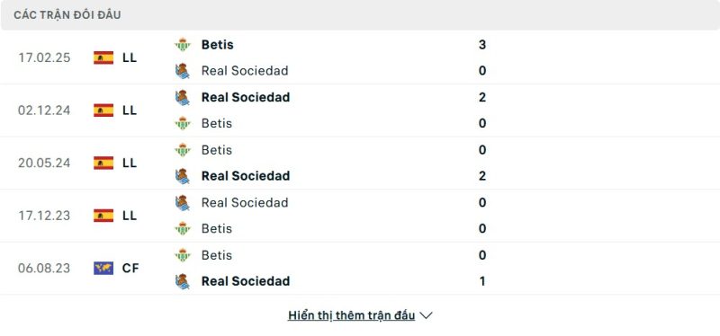 Thành tích đối đầu của Real Betis vs Real Sociedad