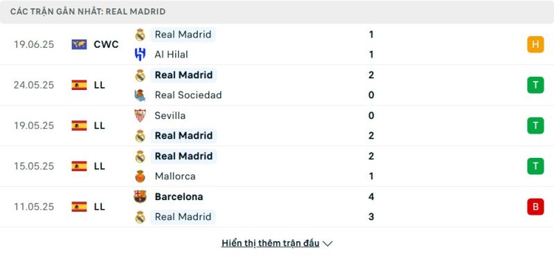 Thống kê phong độ gần đây Real Madrid vs CF Pachuca