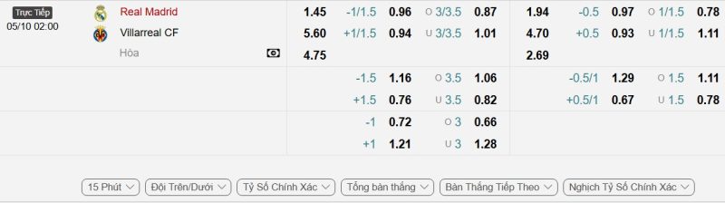 - Kèo tỷ số bóng đá hiệp 1: Real Madrid 2-0 Villarreal