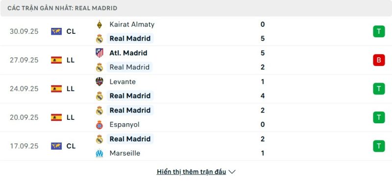 Real Madrid đang thể hiện phong độ khá ổn định tại La Liga với chuỗi thắng 4 trận gần nhất. Dù có thất bại trước Atlético Madrid, họ vẫn duy trì vị trí thứ 2 trên bảng xếp hạng với 18 điểm sau 7 trận. Các trận thắng đáng chú ý gồm chiến thắng 4-0 trước Espanyol và 3-1 trước Real Sociedad. Từ đầu mùa giải, đội bóng hoàng gia Tây Ban Nha cho thấy sức mạnh ổn định và luôn có khả năng bứt phá.