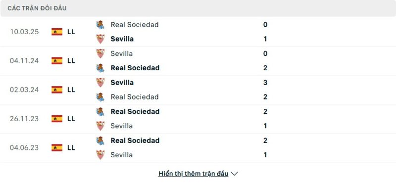 Thành tích đối đầu của Real Sociedad vs Sevilla