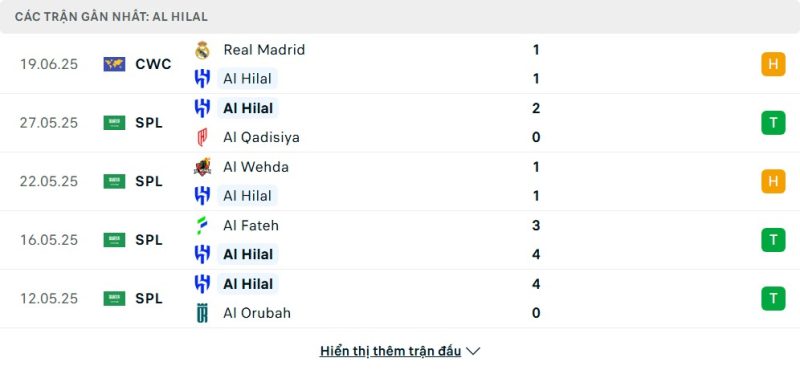 5 trận gần nhất của Al-Hilal: D-W-D-W-W