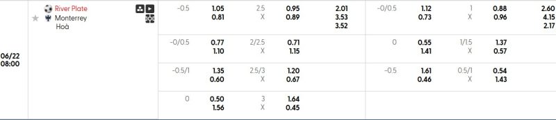 Bảng Tỷ lệ kèo bóng đá River Plate vs CF Monterrey