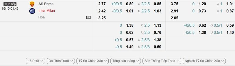 Bảng Tỷ lệ kèo bóng đá Roma vs Inter Milan