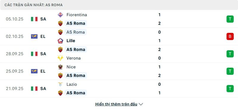 5 trận gần nhất của Roma: W-L-W-W-W