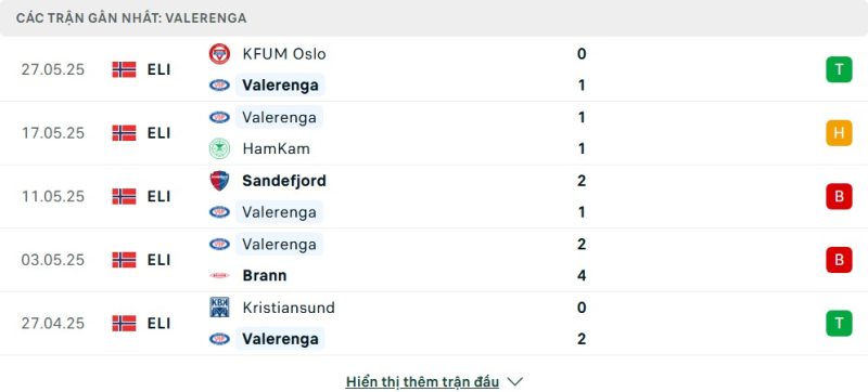 5 trận gần nhất của Vålerenga IF: W-D-L-L-W