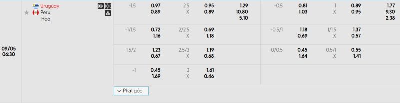 Bảng Tỷ lệ kèo bóng đá Uruguay vs Peru